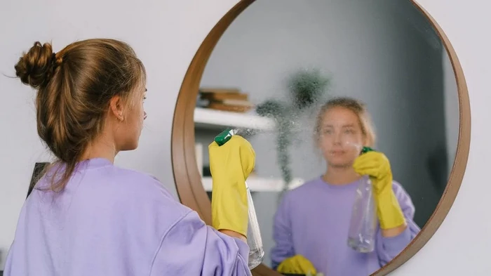 De sleutel tot een streeploze spiegel ligt niet in harder poetsen, maar in de juiste techniek: gebruik altijd twee schone microvezeldoeken – één voor het aanbrengen van de reiniger en één voor het droog en glanzend poetsen.