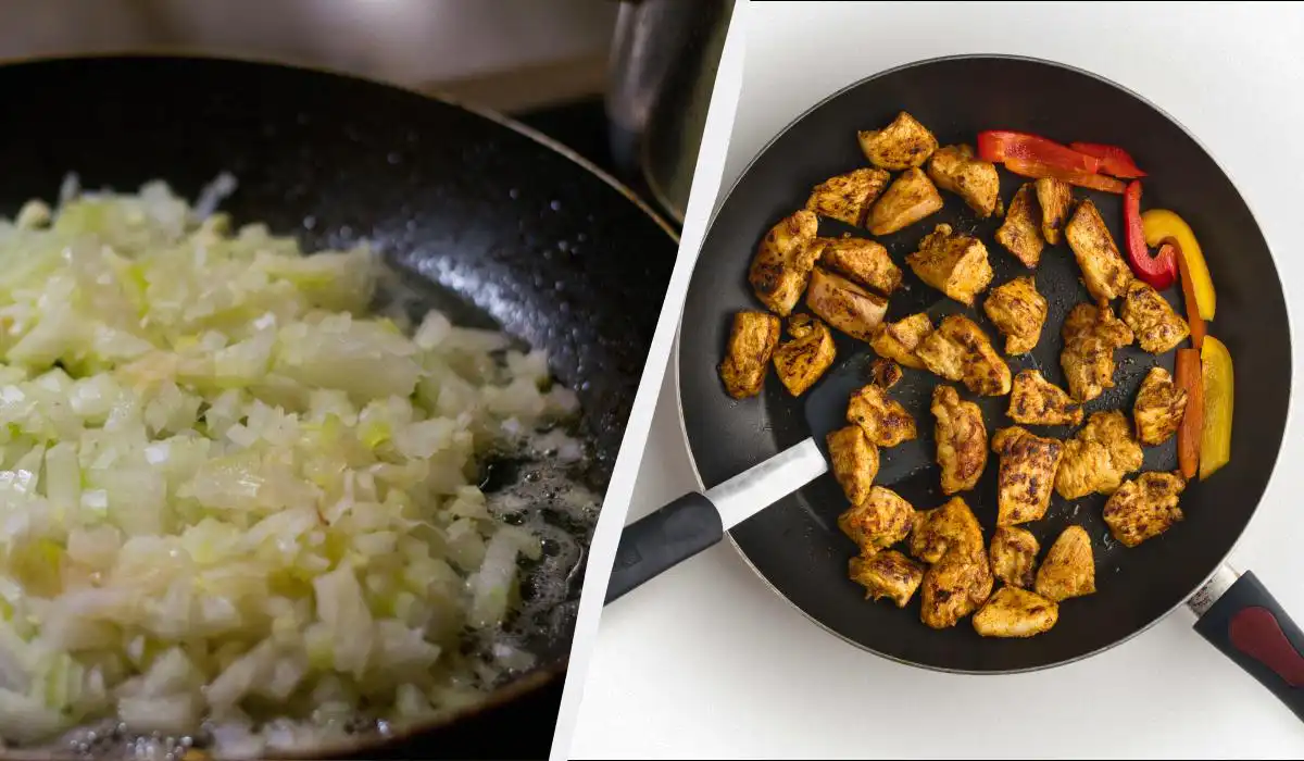 | Eerst vlees bakken, dan ui toevoegen | Vlees krijgt goede kleur. | Ui kookt in vrijgekomen vocht, wordt papperig, mist karamellisatie. |