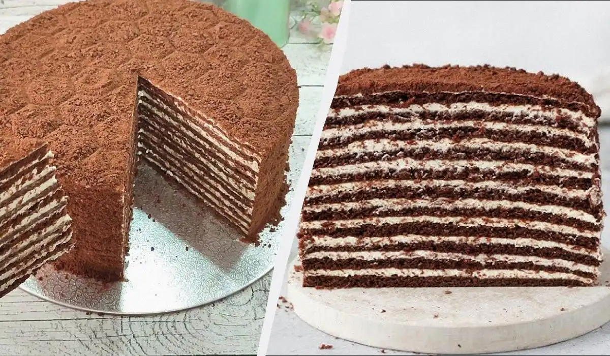 De grootste uitdaging bij een Spartacus-taart is het uitrollen van de dunne laagjes deeg, maar dat kan je volledig overslaan. Bak het honing-cacao deeg gewoon in een bakplaat, snijd het in vierkanten en stapel ze met room – je krijgt dezelfde zachte textuur zonder gedoe.