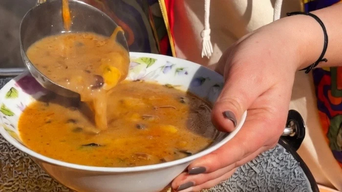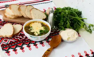 De laatste toets is de zavarka (vulling). Dit is wat de yushka zijn romige, gebonden textuur geeft zonder te zwaar te worden. Meng de zure room en bloem tot een gladde pasta, verdun dan met een beetje koud water uit de soep. Giet dit mengsel in een dunne straal in de kokende soep, onder constant roeren met een garde. Laat nog 2-3 minuten zachtjes doorkoken – de soep zal mooi binden en glanzen.